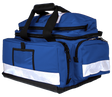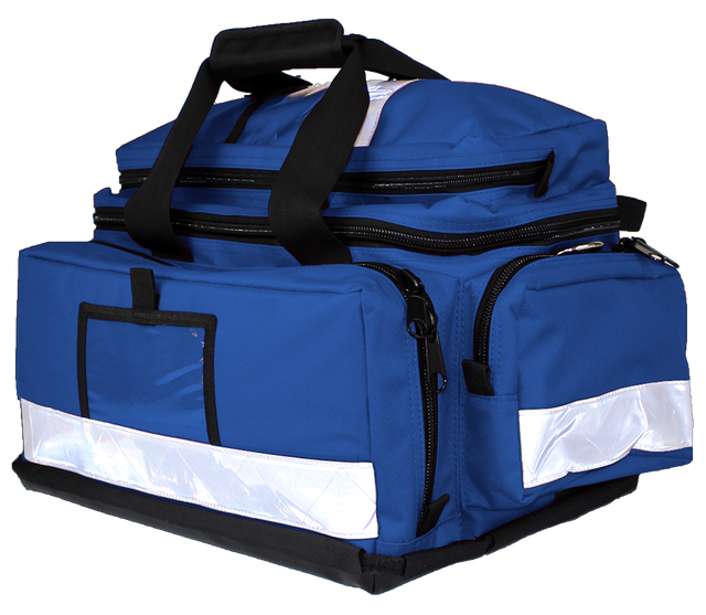 A large blue trauma carry bag with reflective tape, carry handles, multiple pockets and a main compartment with dividers.